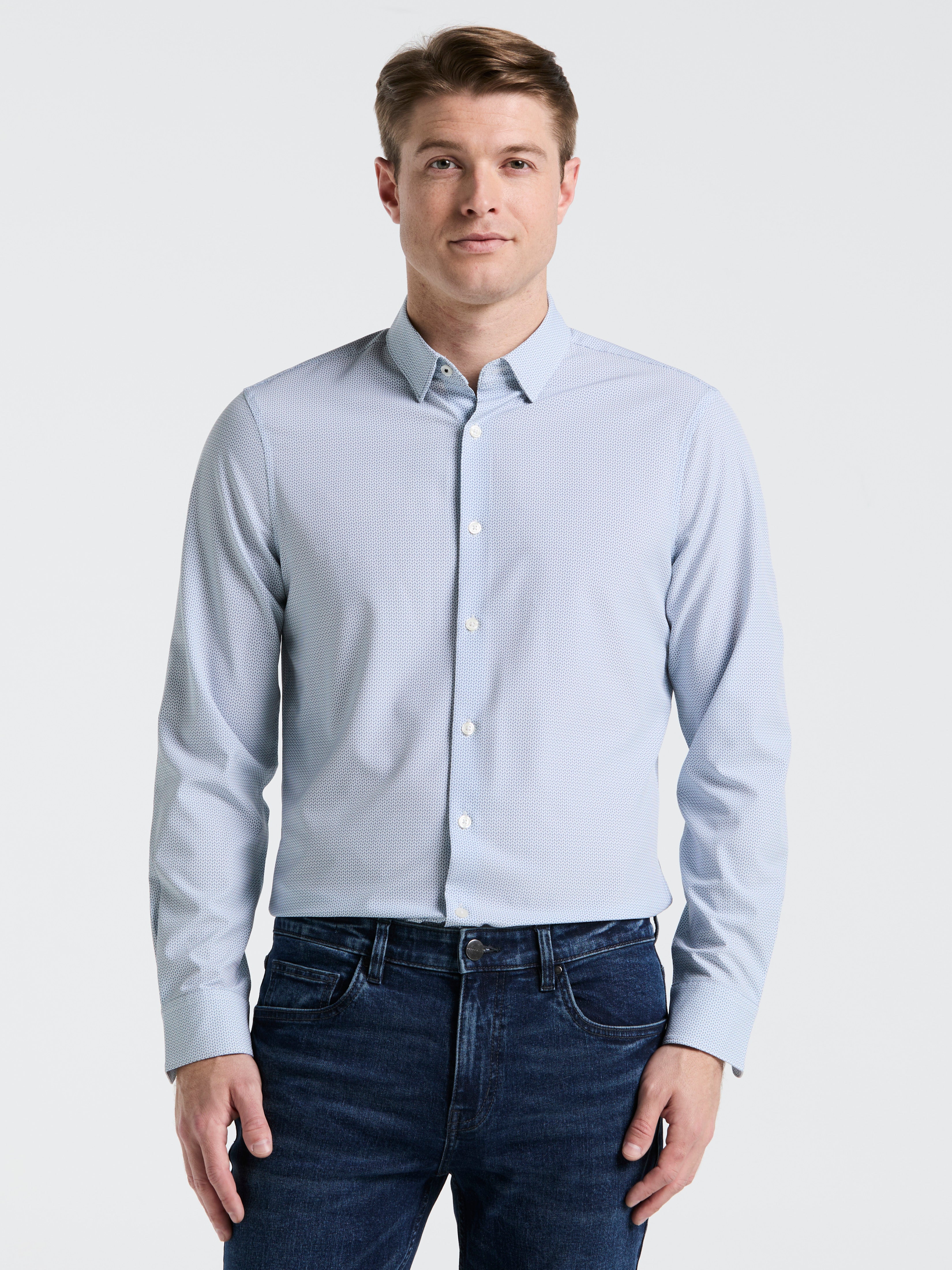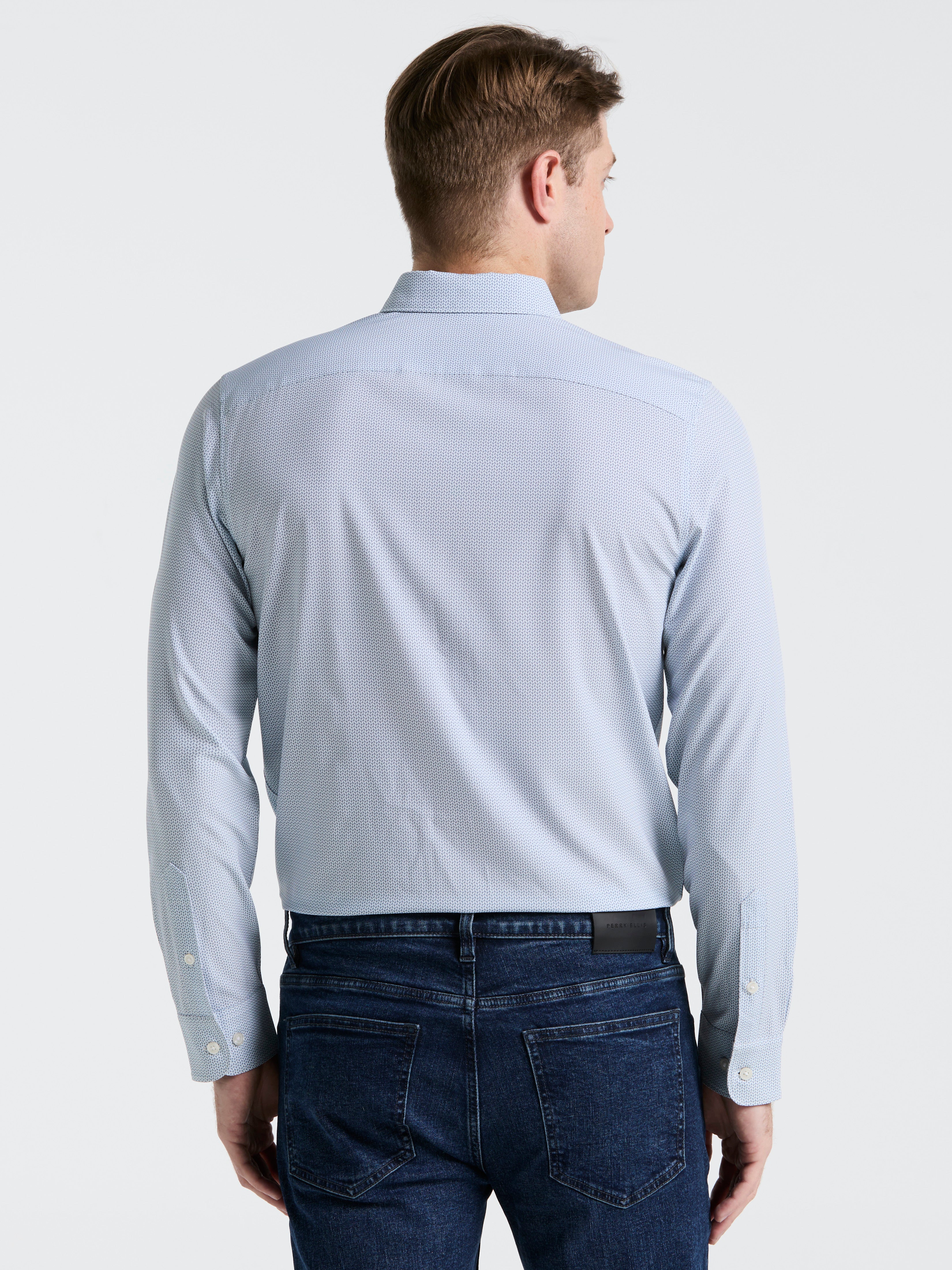 Diseñada para quienes buscan estilo y funcionalidad en la oficina o en ocasiones especiales, esta camisa de manga larga en color Blue Mirage combina un sutil patrón float con la comodidad de un tejido stretch que brinda libertad de movimiento.