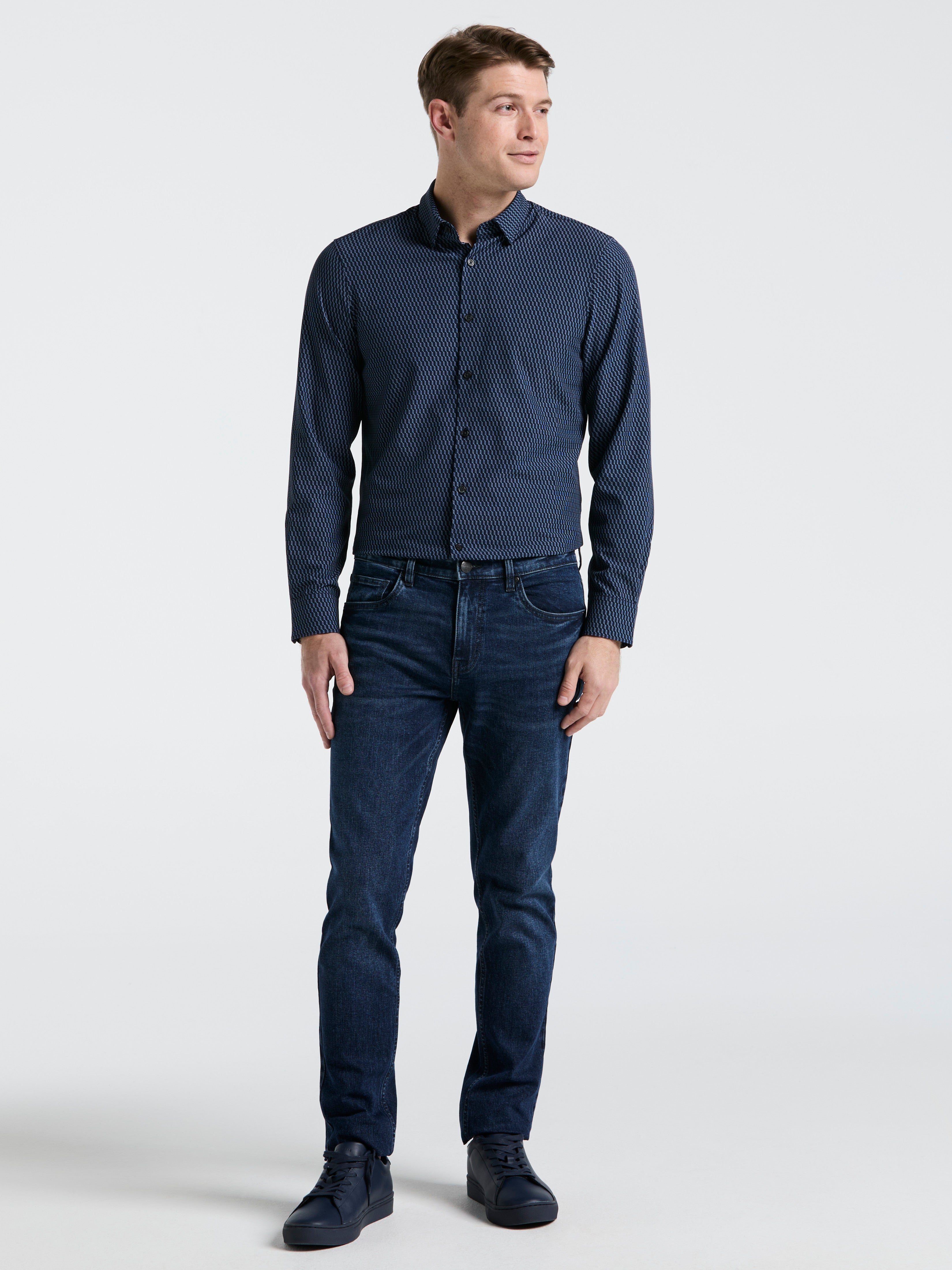 El balance perfecto entre modernidad y comodidad. Esta camisa Slim Fit de manga larga en color Dark Sapphire incorpora un microestampado geométrico que eleva cualquier look con un detalle elegante y contemporáneo.