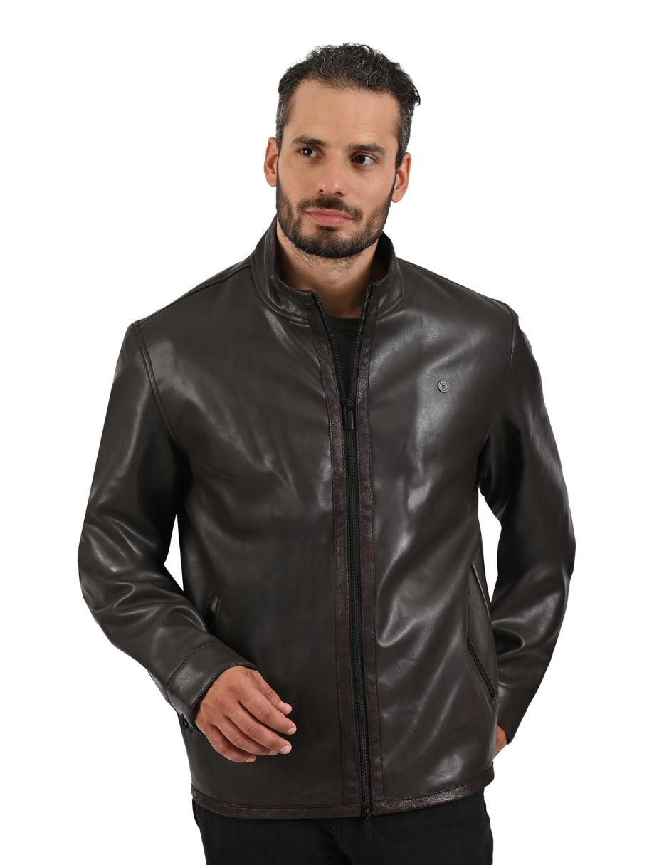 Proyecta un estilo moderno y sofisticado con la Chamarra Café Oscuro Tipo Piel con Cuello Alto de Perry Ellis. Su diseño minimalista con cierre completo y acabado tipo cuero la convierte en una prenda versátil y elegante, perfecta para complementar tus looks casuales o urbanos.