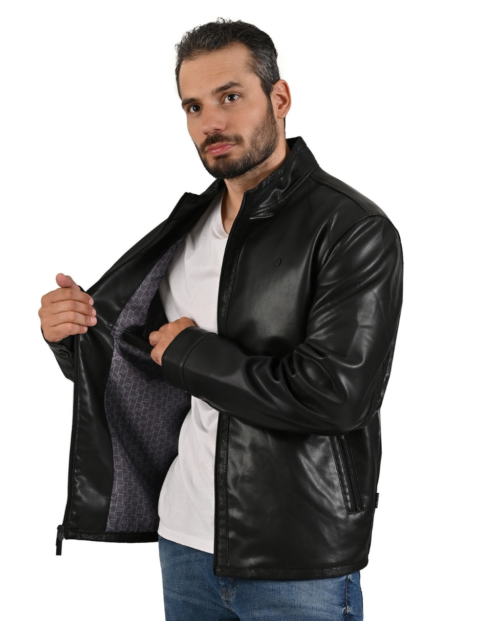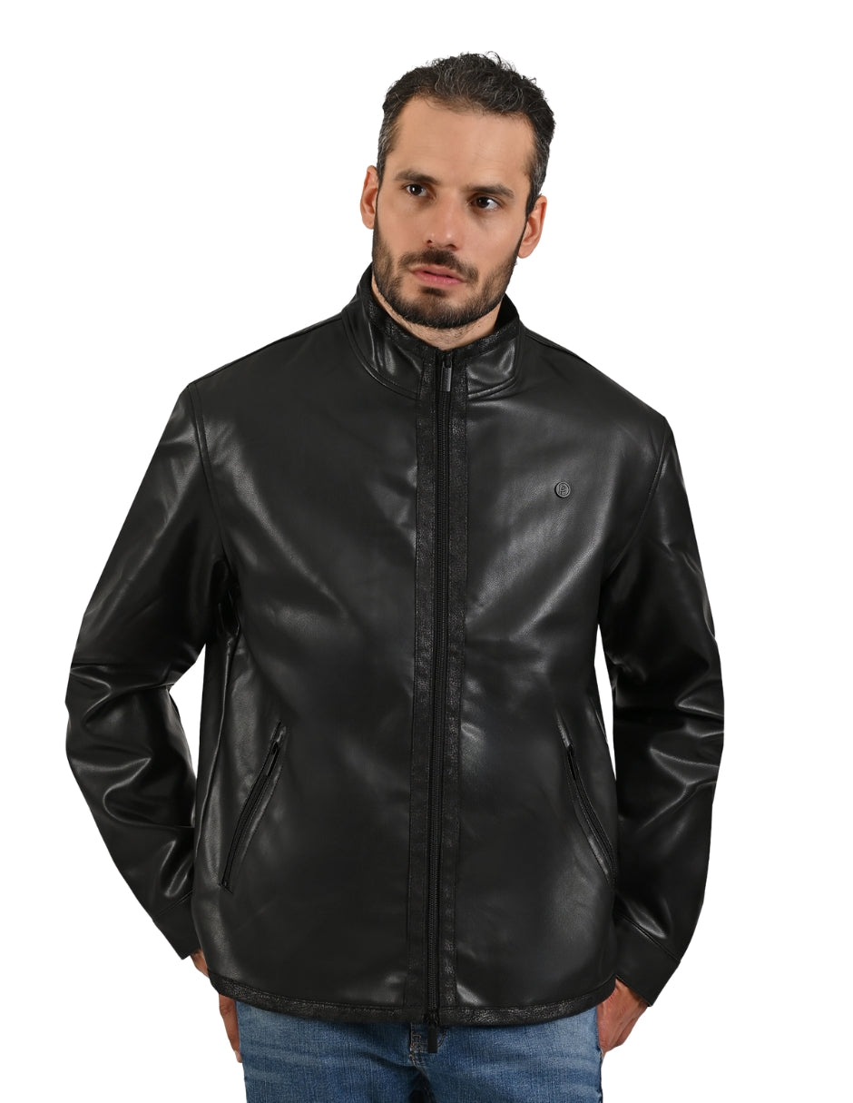 Chamarra Negra Tipo Action Leather con Cuello Alto