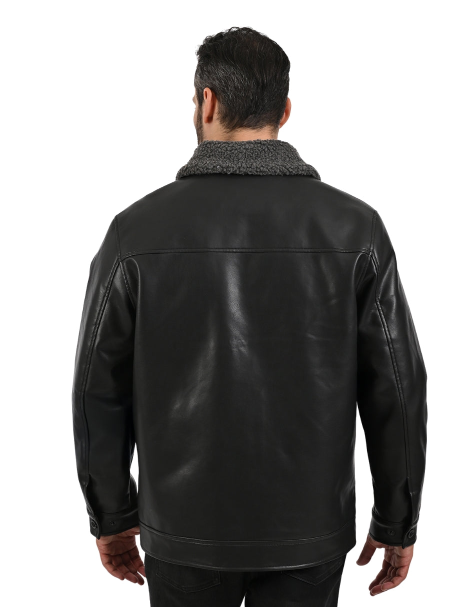 Chamarra Negra Tipo Action Leather con Cuello de Borrega