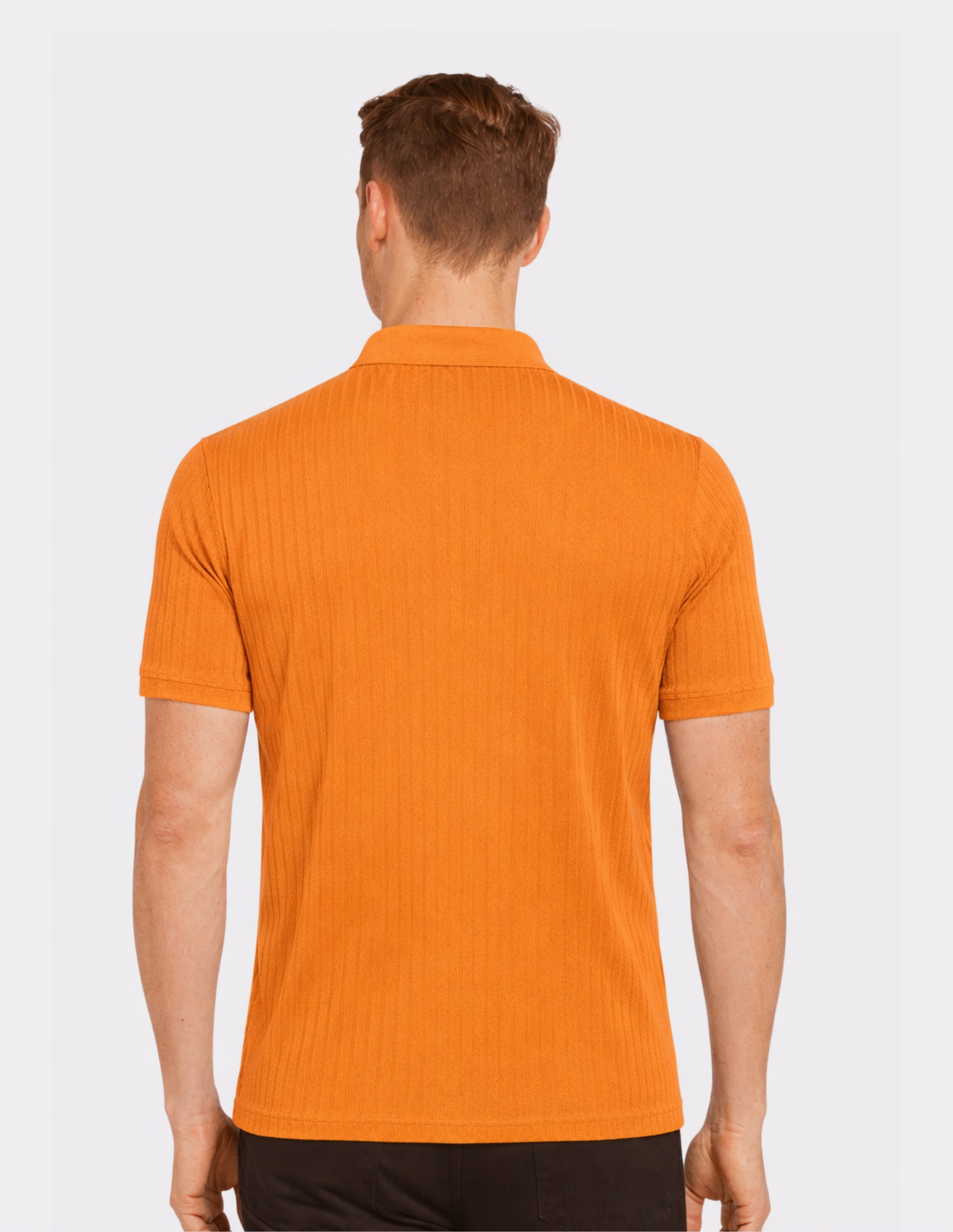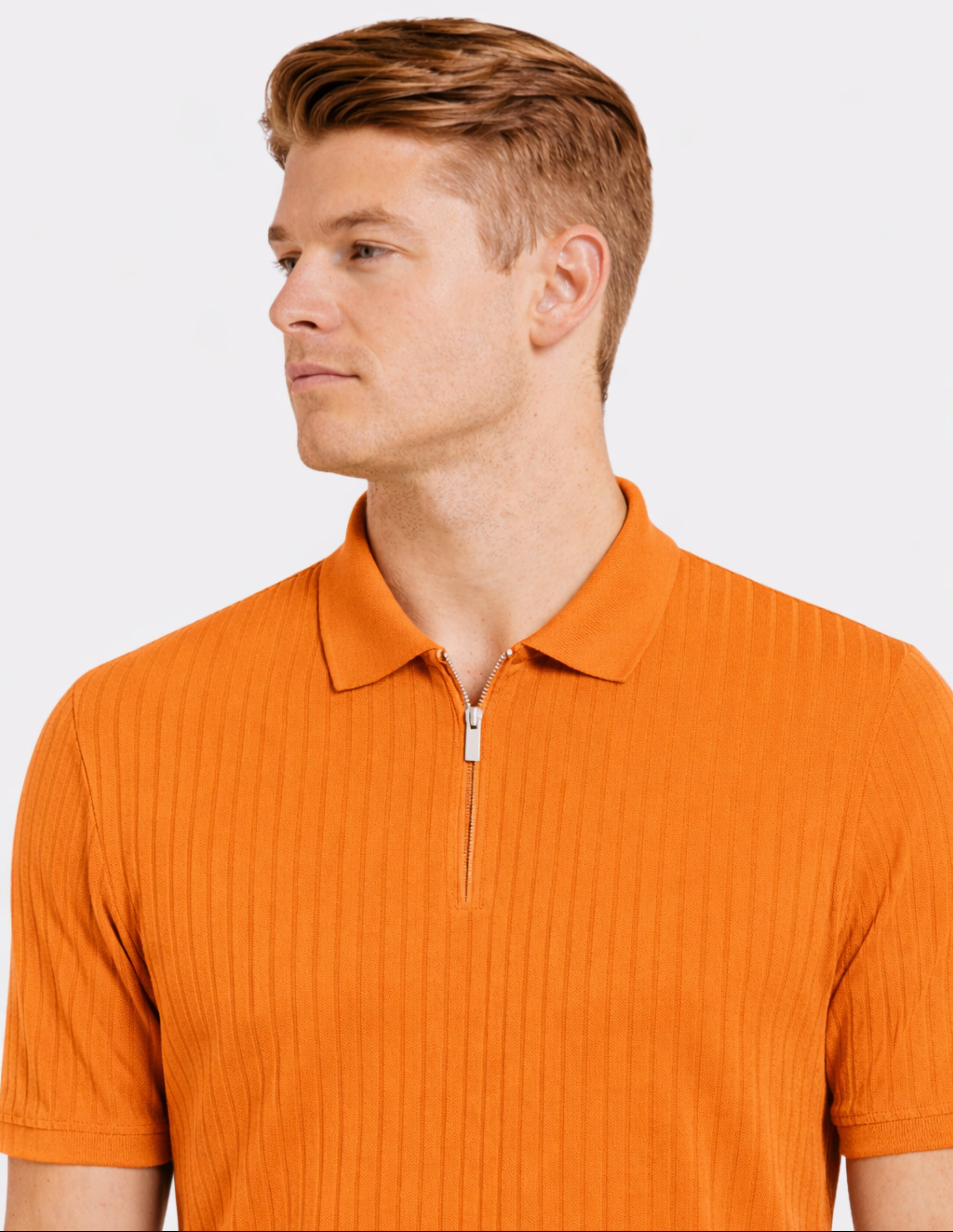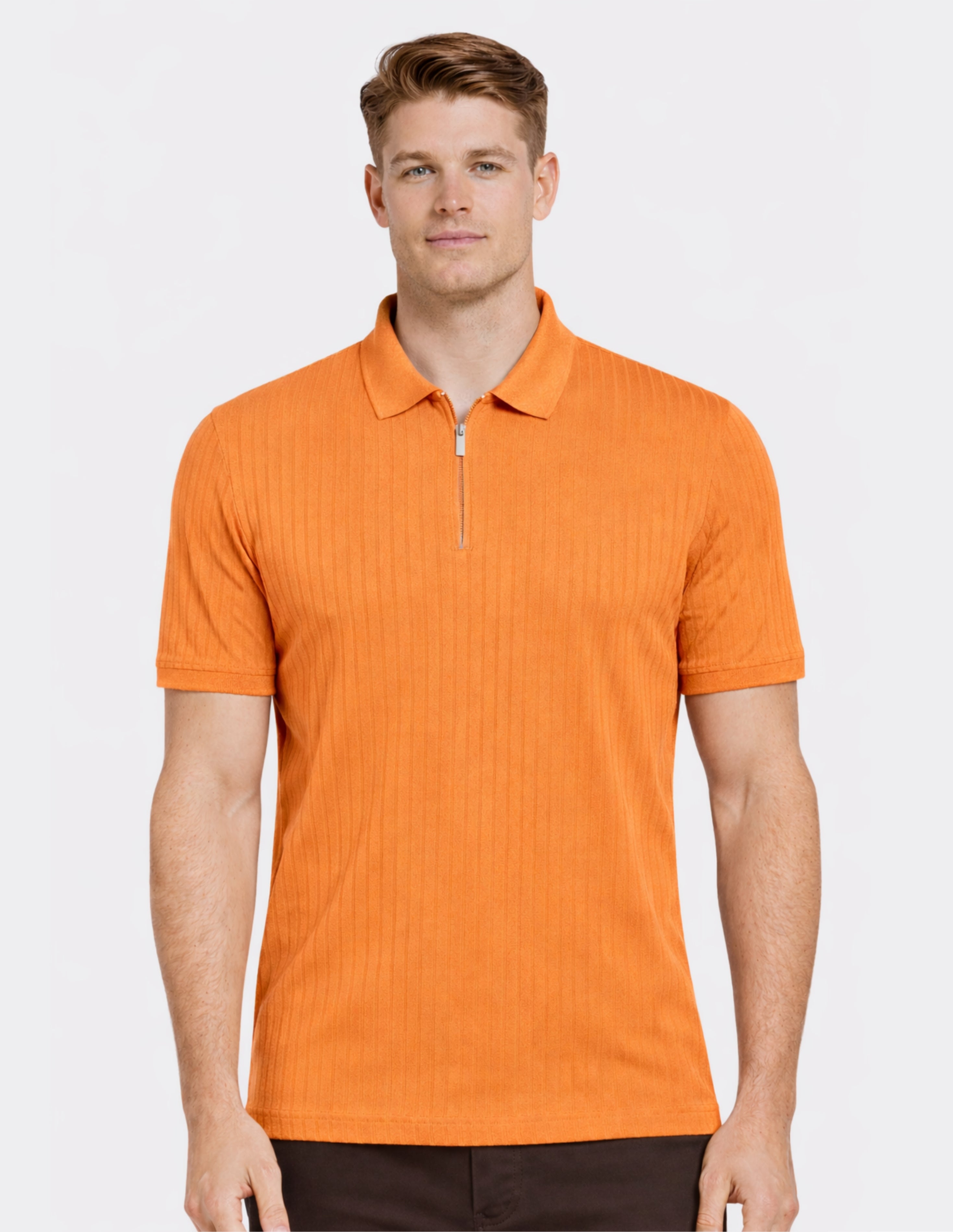 La polo en tono Brandied Melón aporta un giro moderno y fresco al clásico polo de manga corta. Su diseño con textura rib vertical estiliza visualmente la silueta, mientras el cierre con medio zip suma un toque contemporáneo y funcional.